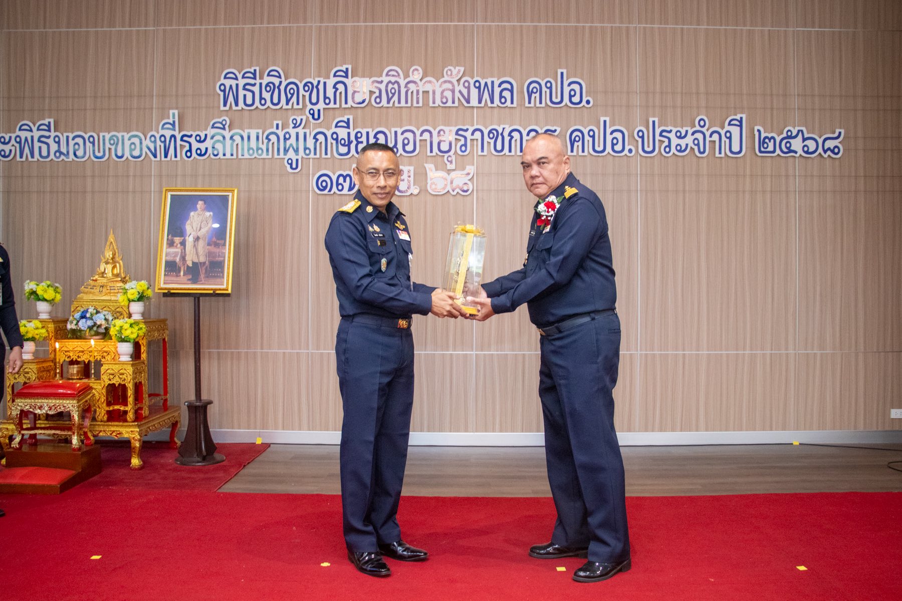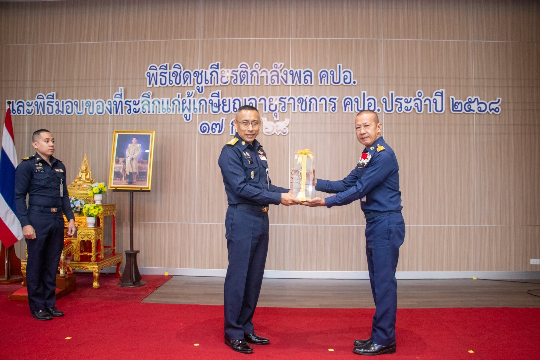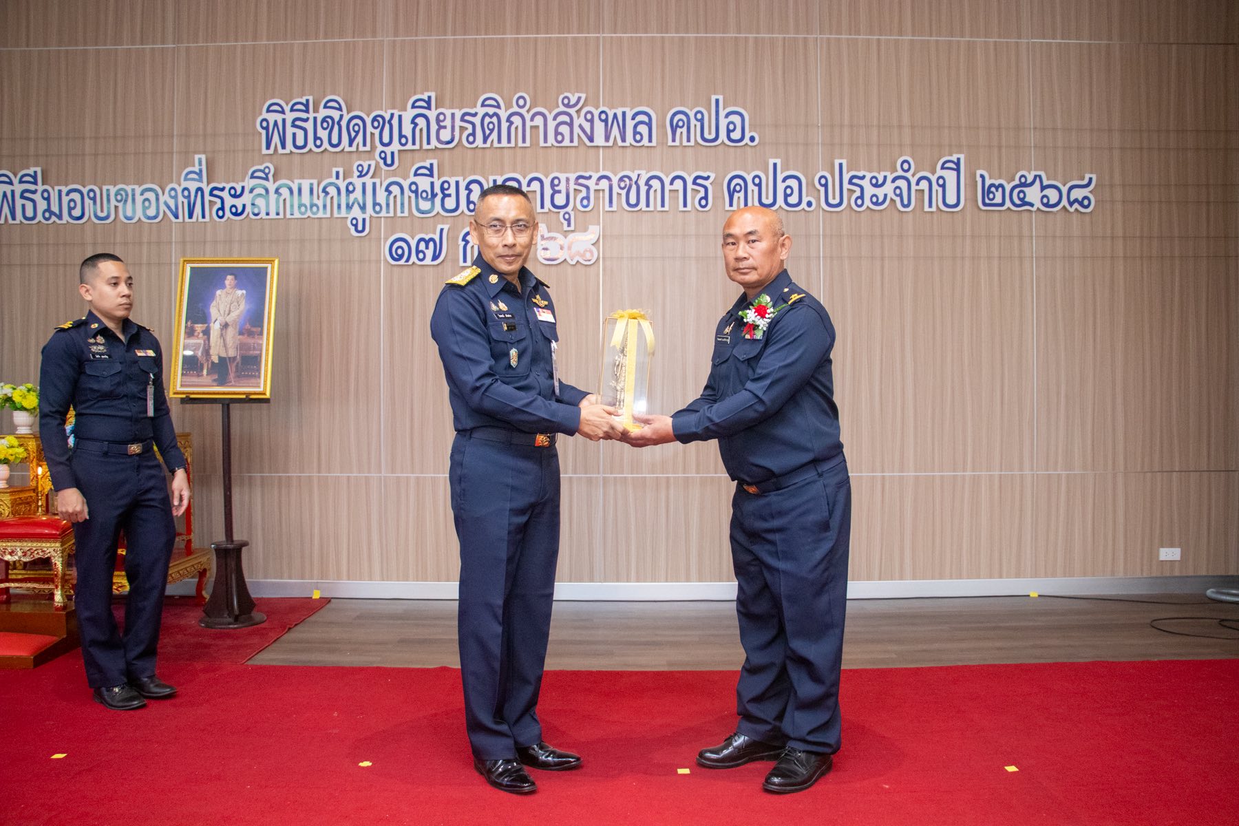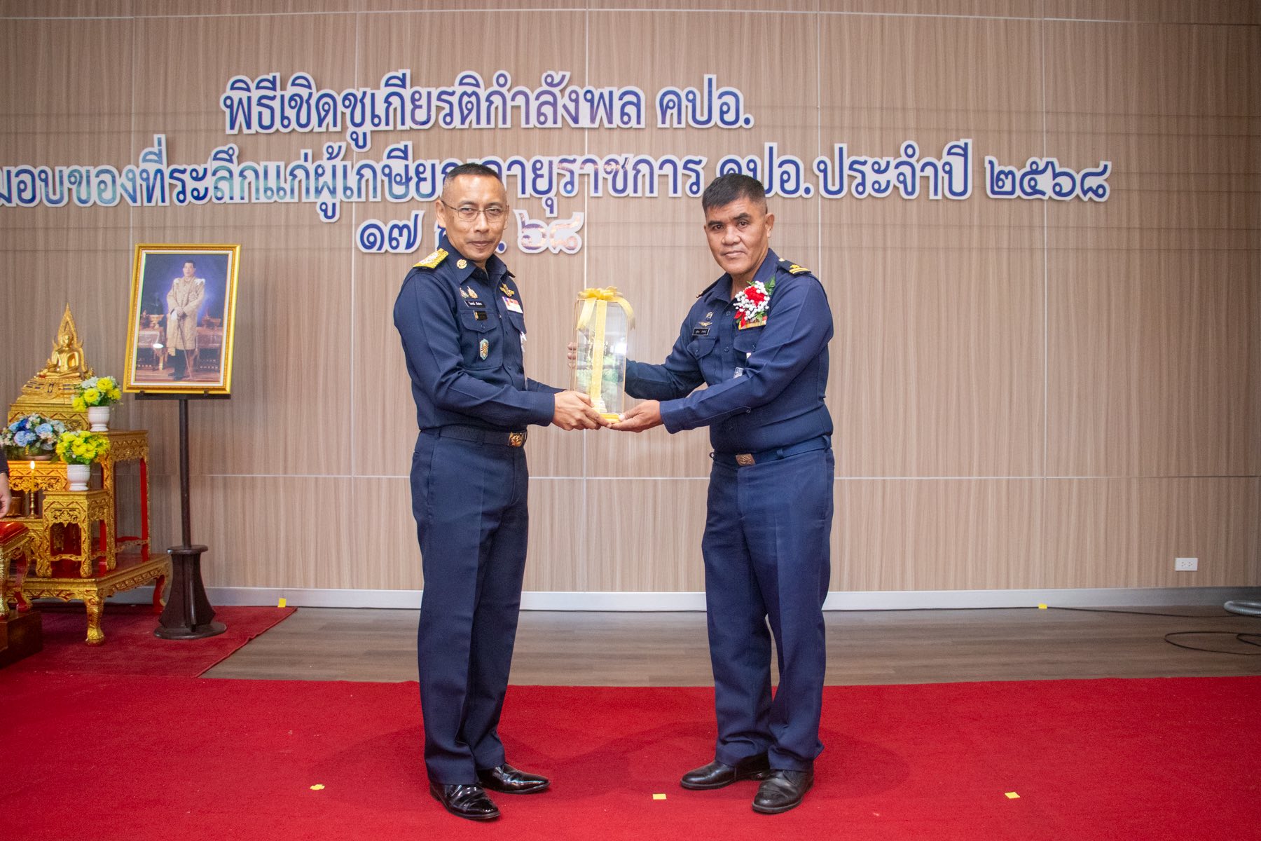 พลอากาศเอก ไวพจน์ เกิงฝาก ผู้บัญชาการกองบัญชาการควบคุมการปฏิบัติทางอากาศ เป็นประธานในพิธีมอบของที่ระลึกแก่ผู้เกษียณอายุราชการ ประจำปี 2568 เพื่อเป็นการตอบแทนคุณงามความดี ยกย่อง และเป็นเกียรติ แก่ผู้ที่ได้ปฏิบัติหน้าที่ราชการมาด้วยความวิริยะ อุตสาหะ จนถึงวันครบกําหนดเกษียณอายุ โดยมี ผู้บังคับบัญชาระดับสูง หัวหน้าหน่วยขึ้นตรง ร่วมเป็นเกียรติในพิธีฯ โดยในปีนี้ มีผู้เกษียณอายุราชการ จำนวนทั้งสิ้น 36 คน เป็นนายทหารสัญญาบัตร 28 คน ลูกจ้างประจำ 1 คน พนักงานราชการ 7 คน และร่วมโครงการเกษียณฯก่อนกำหนด จำนวน 11 คน เมื่อวันที่ 17 กันยายน 2568 ณ อาคารอเนกประสงค์ คปอ.กองบัญชาการควบคุมการปฏิบัติทางอากาศ ขอขอบคุณกำลังพลทุกท่านที่ปฏิบัติหน้าที่ด้วยความมุ่งมั่น ตั้งใจ ทุ่มเท และเสียสละ อย่างเต็มกำลังความสามารถ จนครบวาระเกษียณอายุราชการ และขอให้ช่วยเป็นกำลังใจในการสร้างเสริมและพัฒนาหน่วยงานของเราให้แข็งแกร่งมั่นคงยิ่งขึ้น เพื่อพิทักษ์รักษาสถาบันชาติศาสนา และพระมหากษัตริย์ อันเป็นที่รักและเทิดทูนยิ่ง ของพวกเราทุกคนไว้ตลอดไป