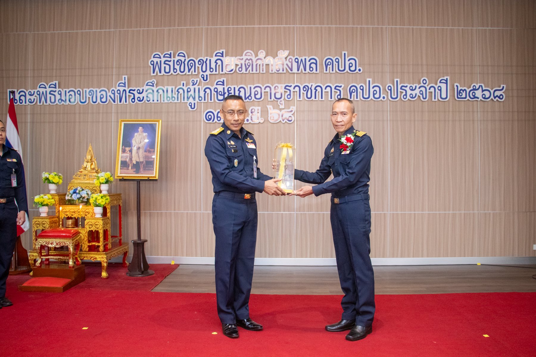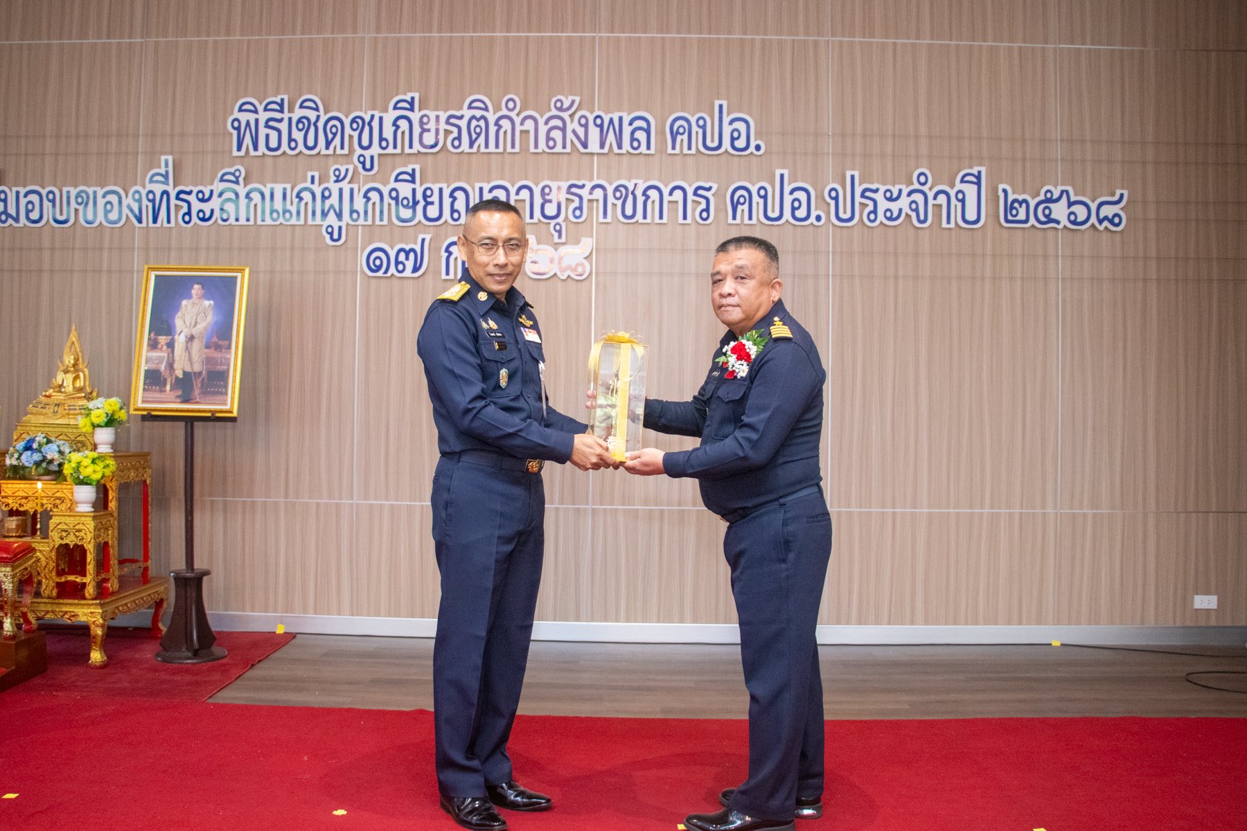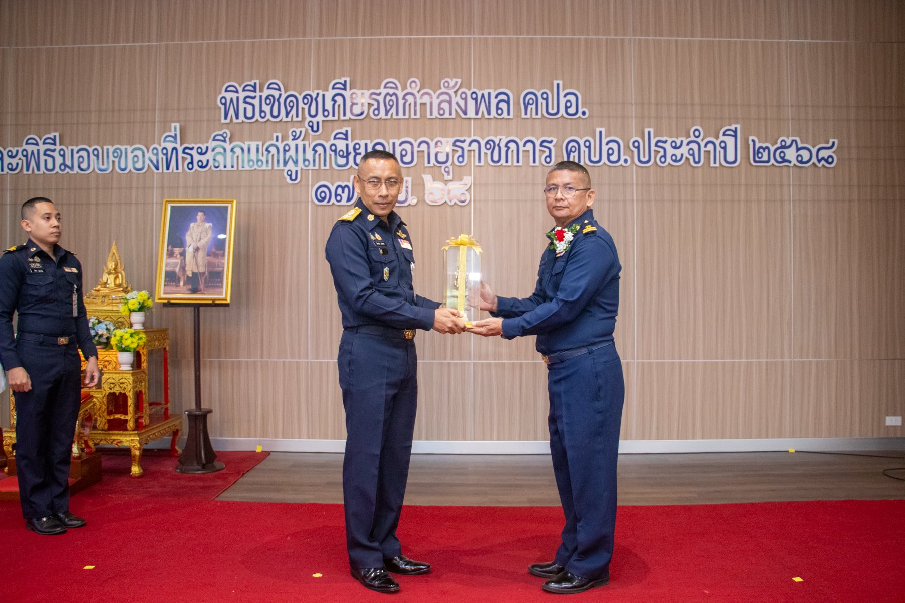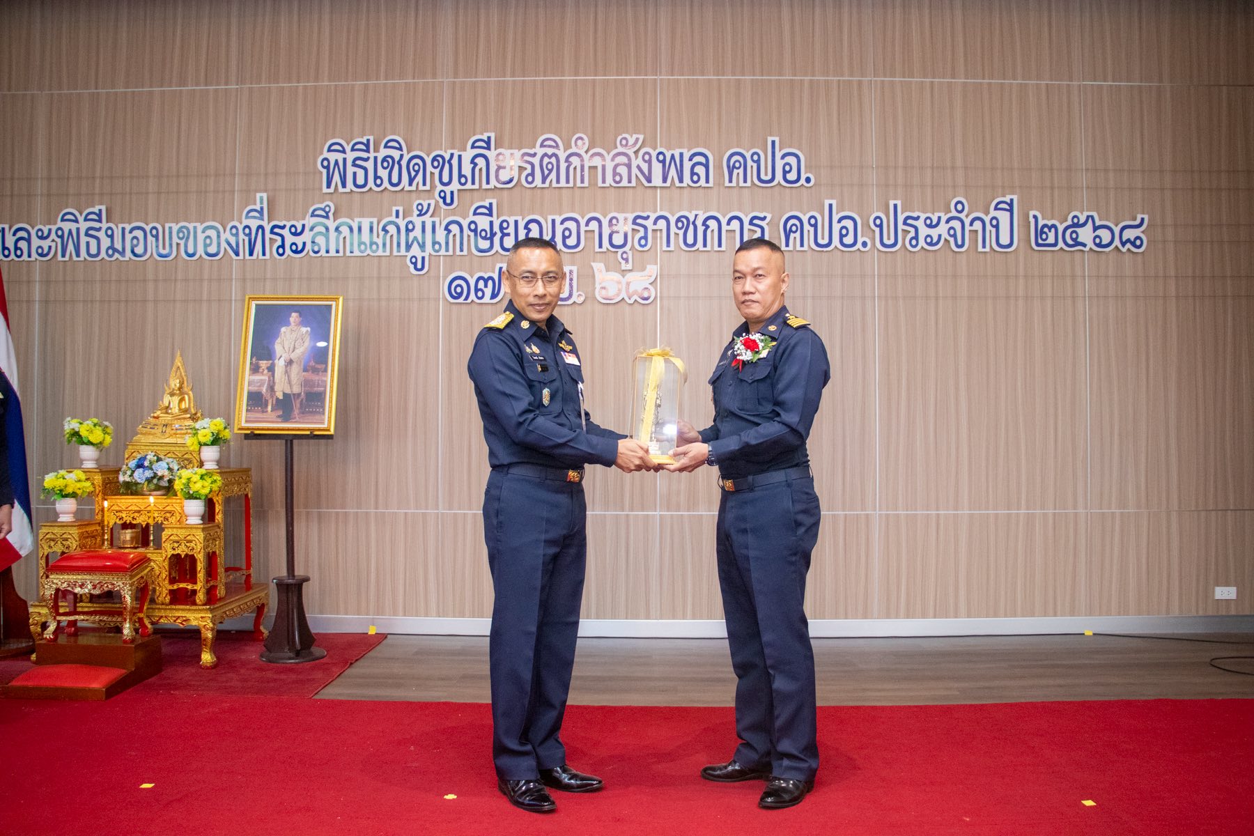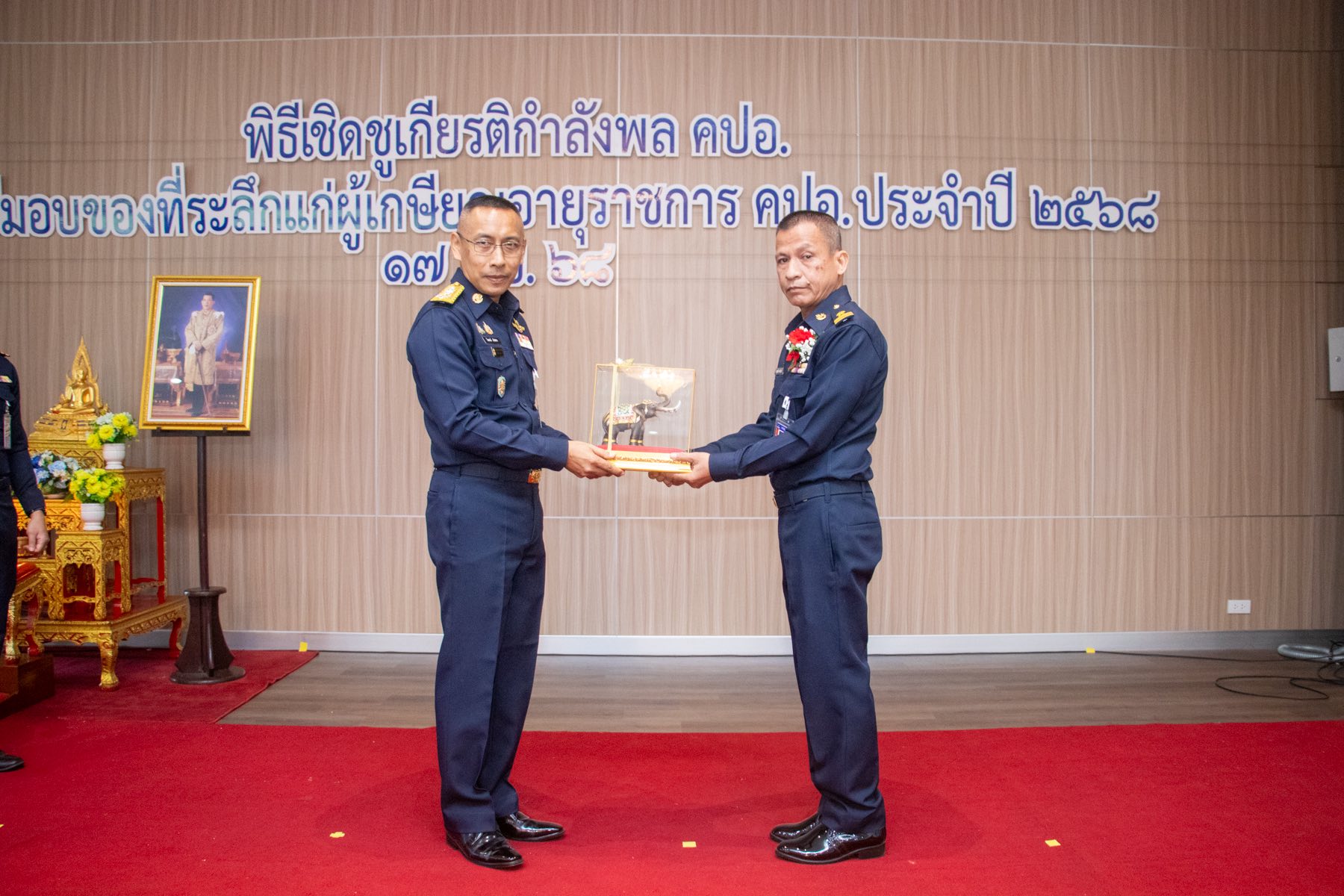 พลอากาศเอก ไวพจน์ เกิงฝาก ผู้บัญชาการกองบัญชาการควบคุมการปฏิบัติทางอากาศ เป็นประธานในพิธีมอบของที่ระลึกแก่ผู้เกษียณอายุราชการ ประจำปี 2568 เพื่อเป็นการตอบแทนคุณงามความดี ยกย่อง และเป็นเกียรติ แก่ผู้ที่ได้ปฏิบัติหน้าที่ราชการมาด้วยความวิริยะ อุตสาหะ จนถึงวันครบกําหนดเกษียณอายุ โดยมี ผู้บังคับบัญชาระดับสูง หัวหน้าหน่วยขึ้นตรง ร่วมเป็นเกียรติในพิธีฯ โดยในปีนี้ มีผู้เกษียณอายุราชการ จำนวนทั้งสิ้น 36 คน เป็นนายทหารสัญญาบัตร 28 คน ลูกจ้างประจำ 1 คน พนักงานราชการ 7 คน และร่วมโครงการเกษียณฯก่อนกำหนด จำนวน 11 คน เมื่อวันที่ 17 กันยายน 2568 ณ อาคารอเนกประสงค์ คปอ.กองบัญชาการควบคุมการปฏิบัติทางอากาศ ขอขอบคุณกำลังพลทุกท่านที่ปฏิบัติหน้าที่ด้วยความมุ่งมั่น ตั้งใจ ทุ่มเท และเสียสละ อย่างเต็มกำลังความสามารถ จนครบวาระเกษียณอายุราชการ และขอให้ช่วยเป็นกำลังใจในการสร้างเสริมและพัฒนาหน่วยงานของเราให้แข็งแกร่งมั่นคงยิ่งขึ้น เพื่อพิทักษ์รักษาสถาบันชาติศาสนา และพระมหากษัตริย์ อันเป็นที่รักและเทิดทูนยิ่ง ของพวกเราทุกคนไว้ตลอดไป