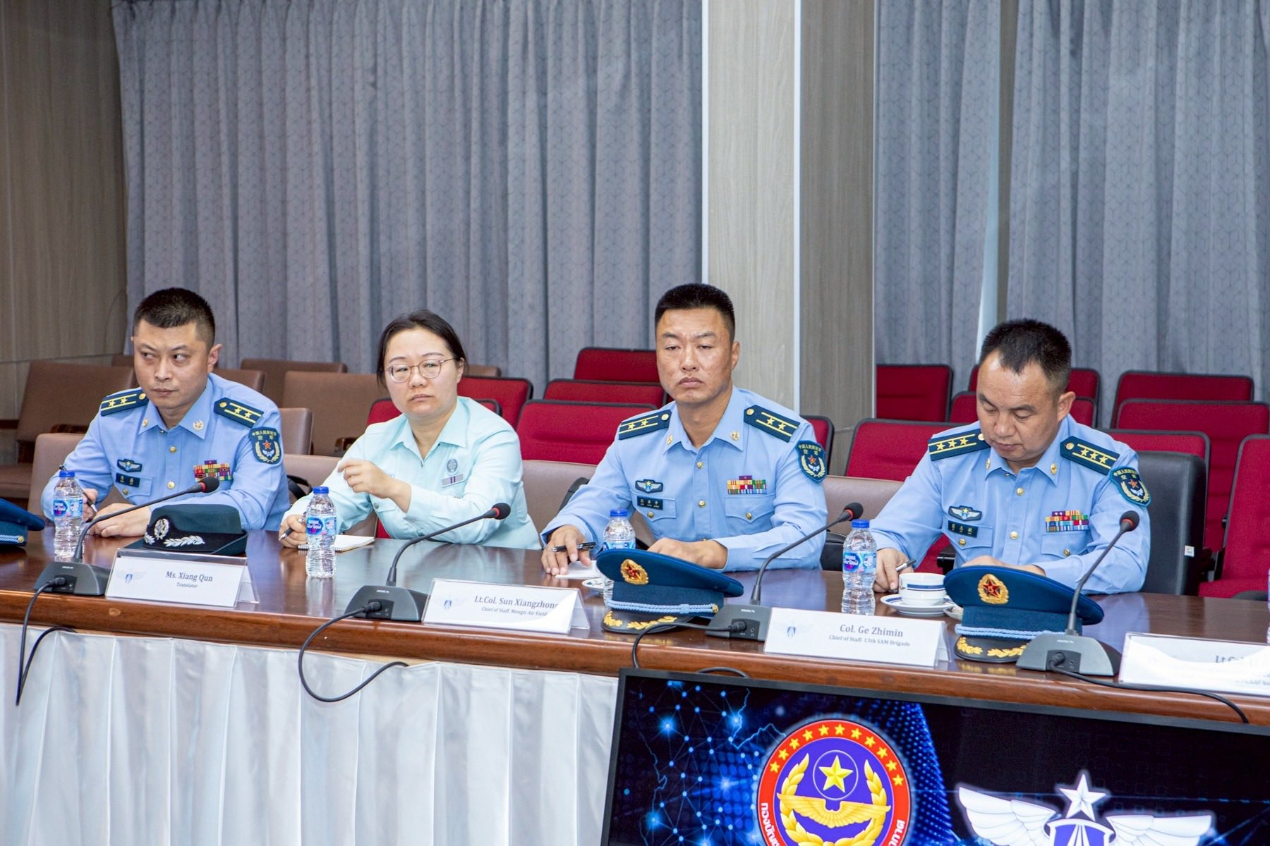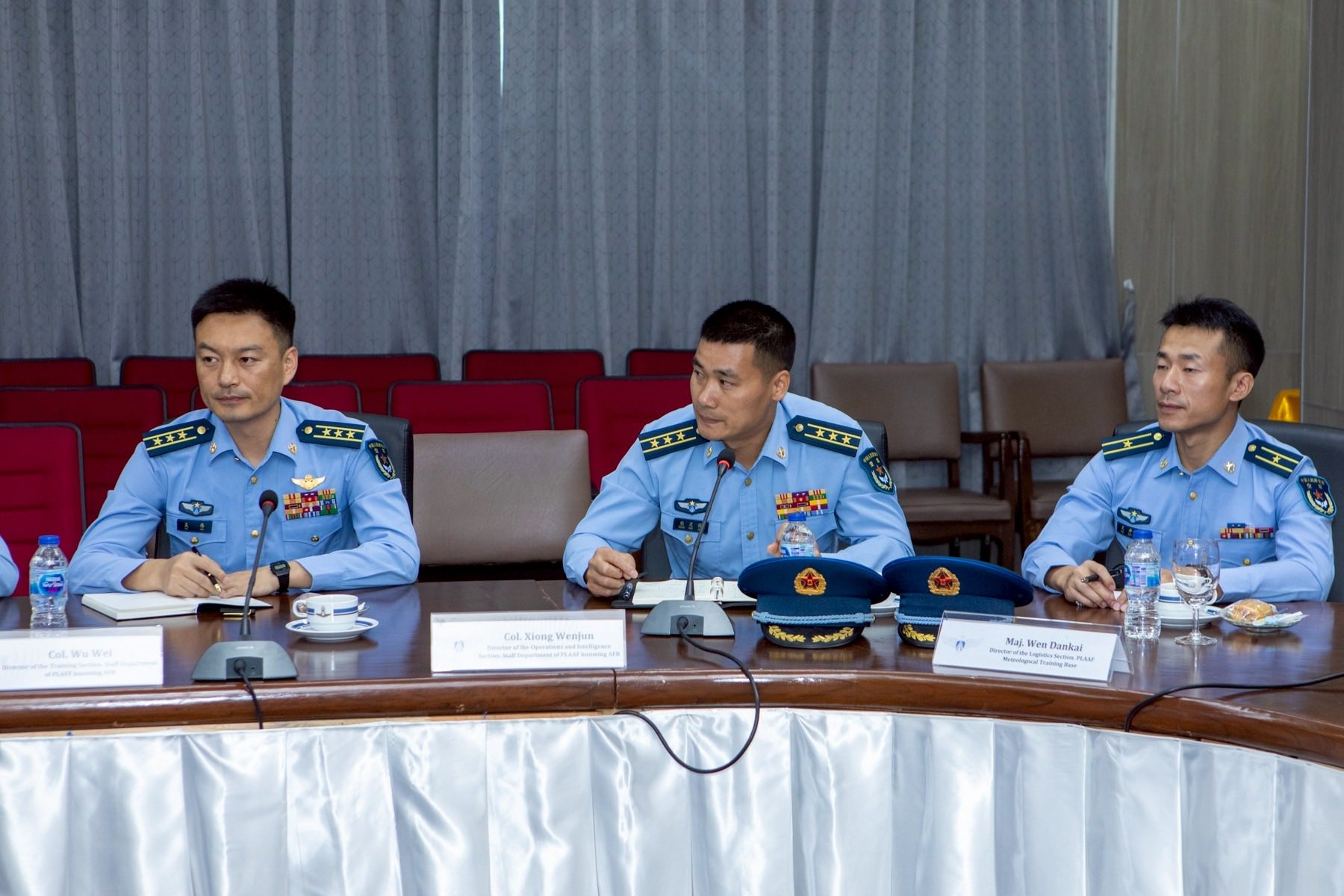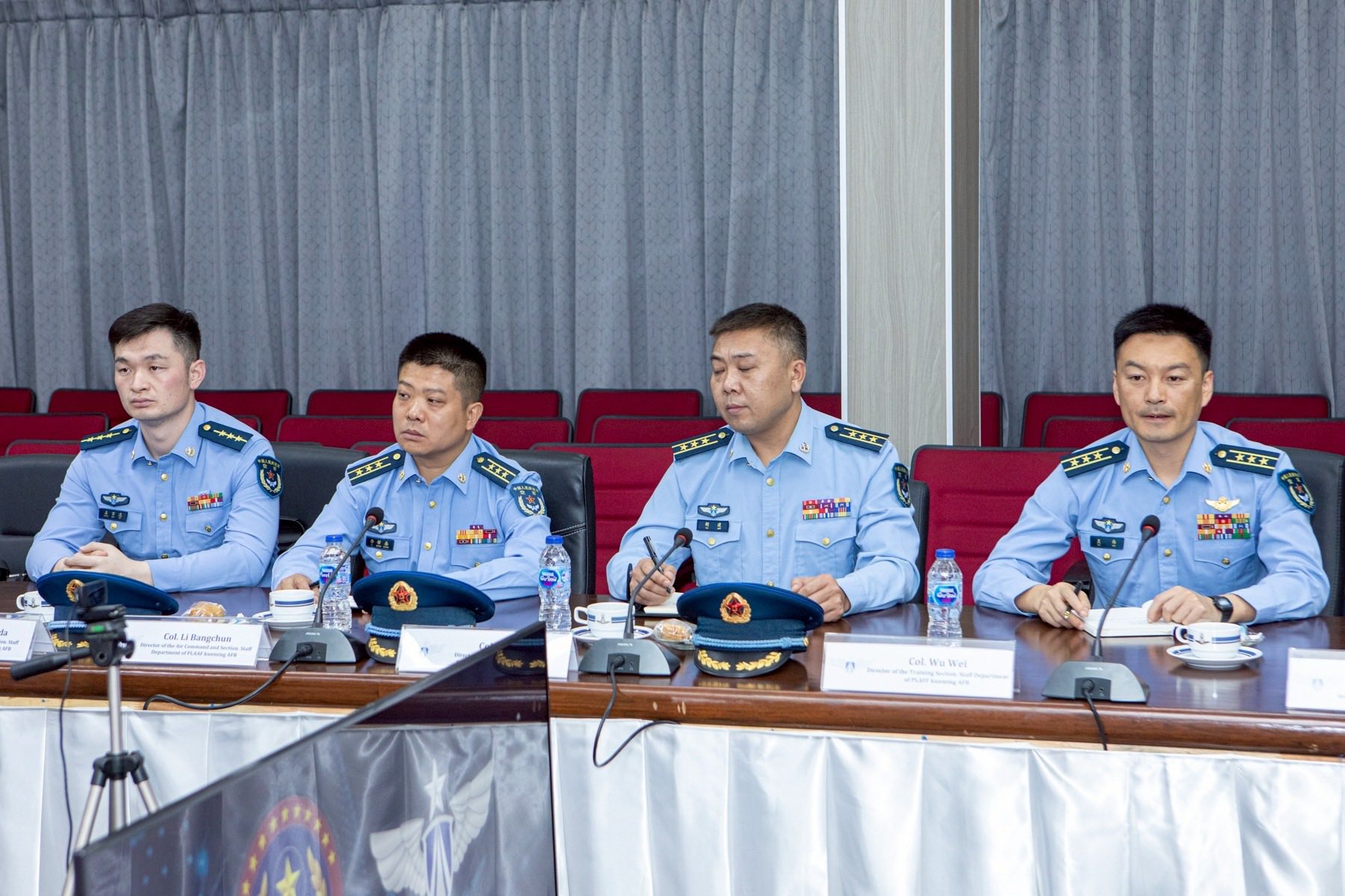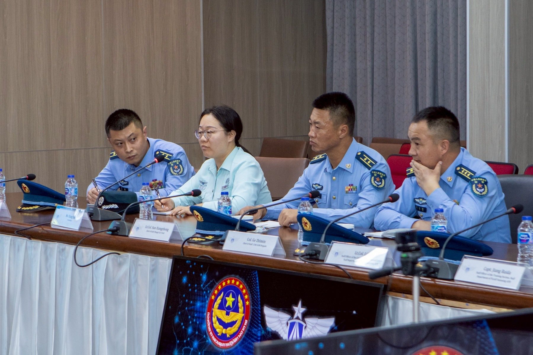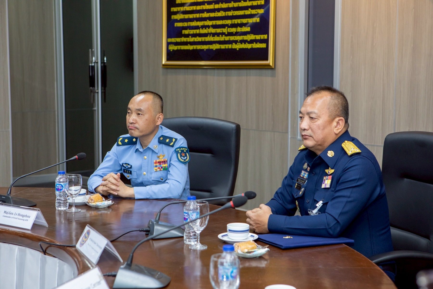 พลอากาศโท ระวิน ถนอมสิงห์ เสนาธิการ กองบัญชาการควบคุมการปฏิบัติทางอากาศ พร้อมด้วยผู้บังคับบัญชาระดับสูง ให้การต้อนรับ พลอากาศตรี หลู่ หง โจว (Maj.Gen. Lv Hongzhou) ผู้บังคับการฐานทัพอากาศคุนหมิง กองทัพอากาศแห่งสาธารณรัฐประชาชนจีน และคณะ ในโอกาสเยี่ยมชมกิจการกองบัญชาการควบคุมการปฏิบัติทางอากาศ โดยคณะฯ ได้รับฟังวิดีทัศน์บรรยายสรุปการปฏิบัติภารกิจของ คปอ.เมื่อวันที่ 16 กันยายน 2568 ณ กองบัญชาการควบคุมการปฏิบัติทางอากาศ