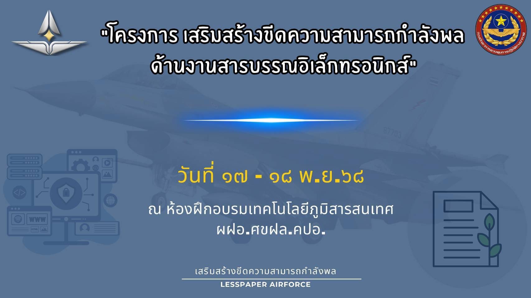 ที่สำคัญ การอบรมนี้มุ่งเน้นการปฏิบัติงานบน "ระบบสารบรรณอิเล็กทรอนิกส์" เพื่อสนับสนุนเจตนารมณ์ของผู้บัญชาการทหารอากาศ ในการขับเคลื่อนกองทัพอากาศสู่การเป็น "Less paper Air Force" อย่างเป็นรูปธรรมการอบรมจัดขึ้นระหว่างวันที่ ๑๗ - ๑๘ พ.ย.๖๘ โดยมีผู้เข้ารับการอบรมเป็นข้าราชการ ลูกจ้าง พนักงานราชการจากสายวิทยาการต่างๆ ในสังกัด คปอ. จำนวน ๔๐ คนคปอ. มุ่งมั่นพัฒนา "คนคุณภาพ" ให้พร้อมปฏิบัติภารกิจในทุกมิติ